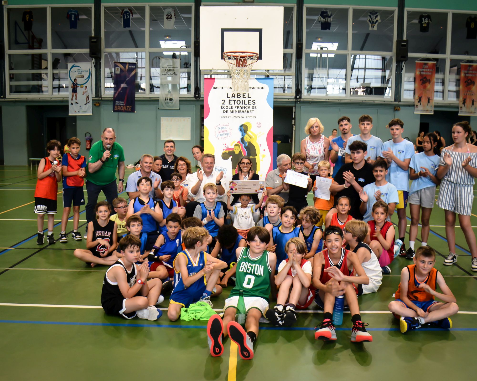 Nous l'avons reçu des mains de Mme Christina Rioux, membre du Comité Directeur de la FFBB au titre du Collège Athlètes de Haut Niveau, ancienne arbitre haut niveau, en présence de M. Jean-Luc Dubos, Président du comité de la Gironde, Mme Françoise Eito, les représentants des municipalités M. Patrick Davet (Maire de La Teste), M. Fabien Dufailly (Adjoint délégué à la Vie Sportive et aux Relations publiques), M. André Moustié (représentant Mme la Maire de Gujan Mestras), le label 2 étoiles de l'École Française de Basket.